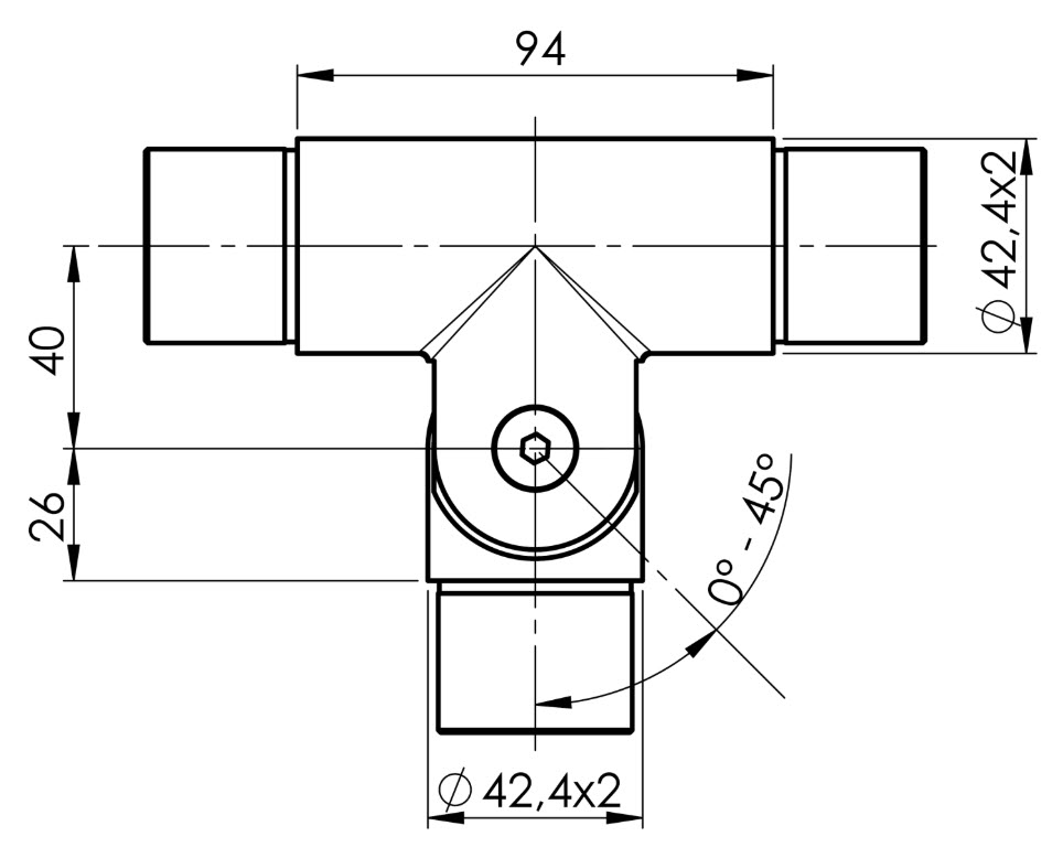 Käsipuu hoidja/ühendus “T” reguleeritav kaldenurk – torule Ø42,4 mm, AISI 304, satiin