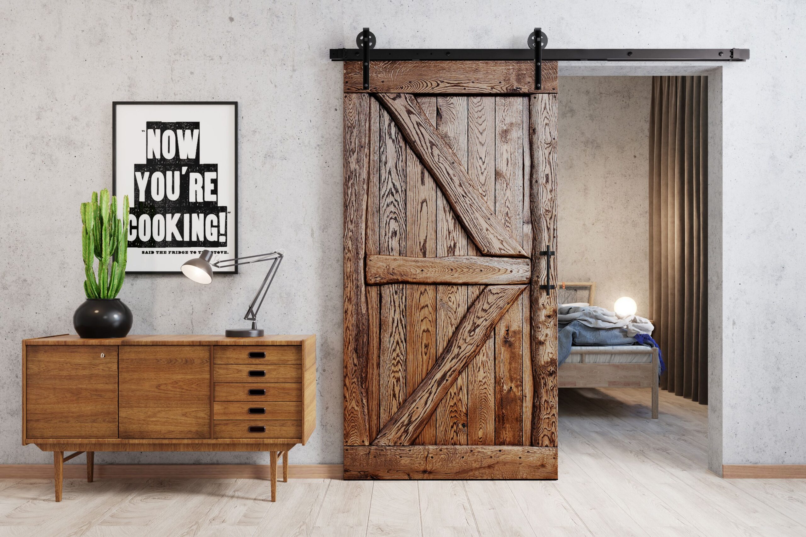 Tüüpiline kasutusstsenaarium: eramaja omanik paigaldab Flinstoni sahvri-, magamistoa- või garderoobiukseks, et ruumisäästlikult eraldada alasid ja lisada ruumile rustikaalne aktsent.
