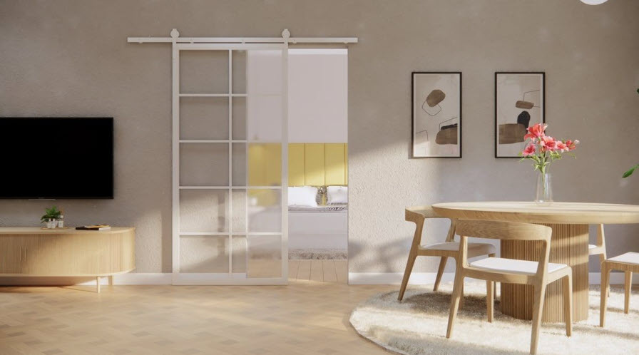Tänu neutraalsele valgele klaasile sobib uks suurepärastelt ruumidesse, kus on vaja natuke privaatsust – näiteks magamistubades, esikutes ja garderoobides. Läbipaistev klaas on parim valik avatud pinnale, kus soovitakse valgusvoogu säilitada. Mõlemad variandid loovad interjööris minimalistliku ja kvaliteetse tulemuse. Pulbervärvitud metallpind talub niiskust, kriimustusi ja igapäevast kasutust, mis teeb sellest lahenduse ka köökide ja vannitoa lähedusse.